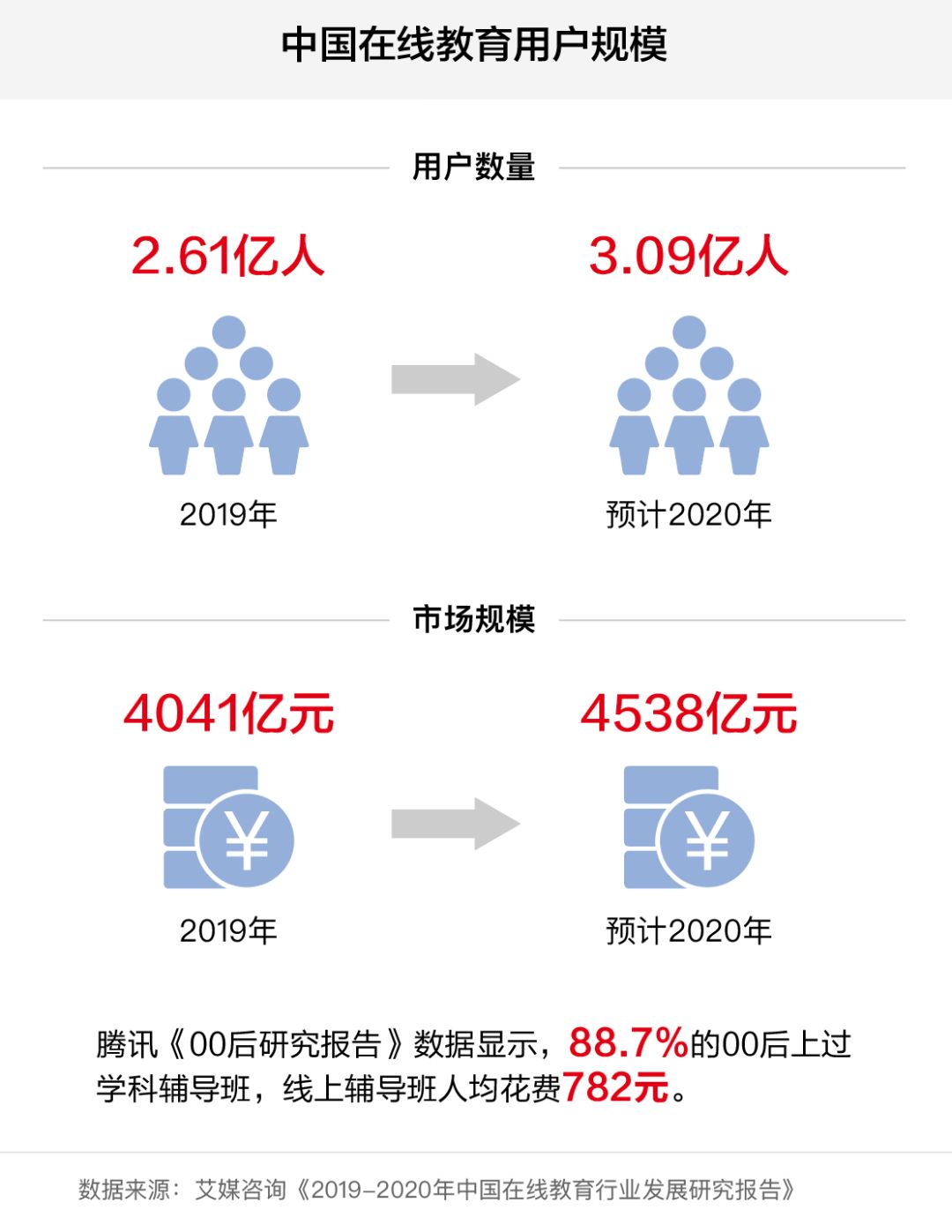 據(jù)艾傳媒咨詢《2019-2020中國在線教育產(chǎn)業(yè)發(fā)展研究報告》顯示,2019年中國在線教育用戶規(guī)模達到2.61億,市場規(guī)模達到4041億元。預(yù)計2020年中國在線教育用戶規(guī)模將達到3.09億。市場規(guī)模將達到4538億元,同比增長15.5%;騰訊《00后研究報告》顯示,88.7%的00后學(xué)生參加過學(xué)科輔導(dǎo)班,在線輔導(dǎo)班平均費用為782元。