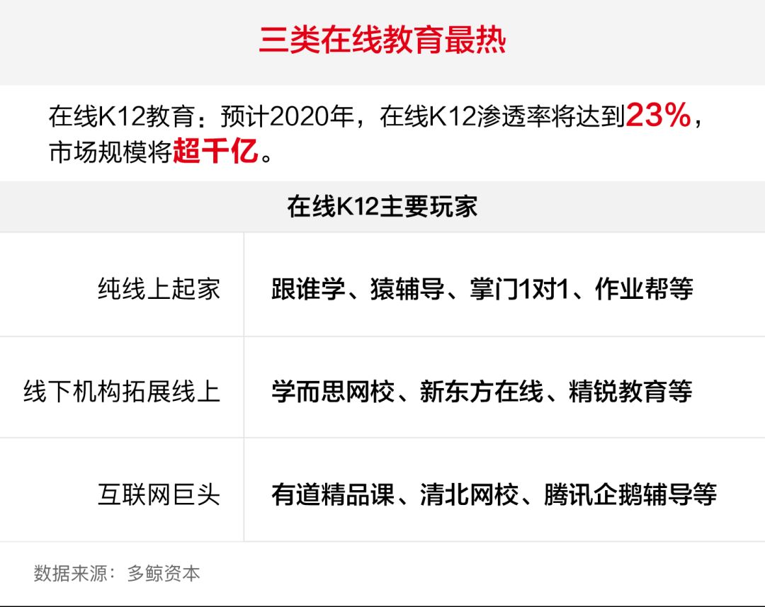 隨著升學(xué)競爭的長期存在,K12課外輔導(dǎo)已經(jīng)成為不可動搖的需要。多鯨資本數(shù)據(jù)顯示,截至2018年,國內(nèi)K12學(xué)生人數(shù)超過1.74億,相應(yīng)的K12課外輔導(dǎo)市場超過4000億元。傳統(tǒng)教育機構(gòu)、互聯(lián)網(wǎng)巨頭、互聯(lián)網(wǎng)團隊等不同背景的創(chuàng)業(yè)者紛紛涌入,以英語、數(shù)學(xué)為主。其中優(yōu)質(zhì)項目吸金能力強,紅杉中國、GGV、IDG等一線資本均完成布局。過去一年,在線k12企業(yè)融資金額最高的是“一對一”E輪融資,融資金額3.5億美元;其次是“小盒子科技”1.5億美元的D輪融資。